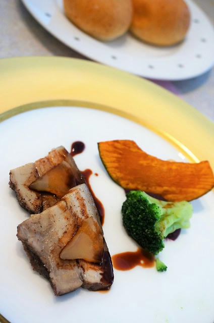 ポークのグラッセ赤ワイン風味 リンゴのコンポート添え。