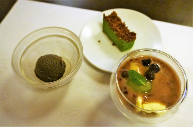 ほうじ茶のシャーベット、抹茶の生チョコ、ココナッツミルクのおぜんざいです。