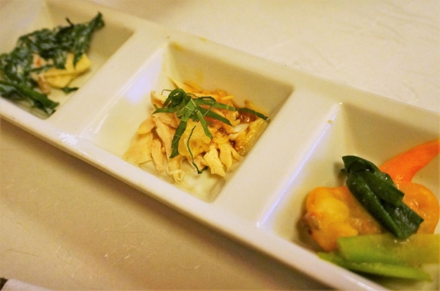 まずは、前菜。蒸し鶏とか白和えとか、ほっとする和食って感じ。