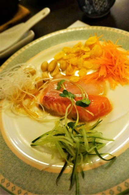 サラダと生魚。コーンフレークとピーナッツ乗ってるのが珍しい。
