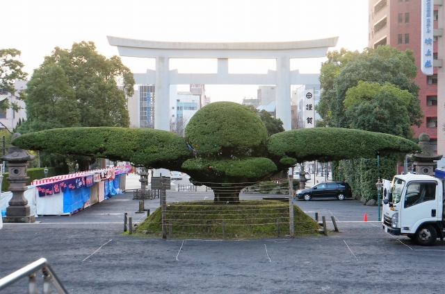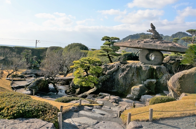 斉鶴とよばれる鳥が翼広げたような植木は迫力あります。