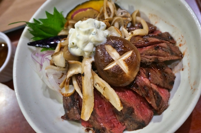 これは晩御飯に食べたステーキ屋さんのハラミステーキ丼。