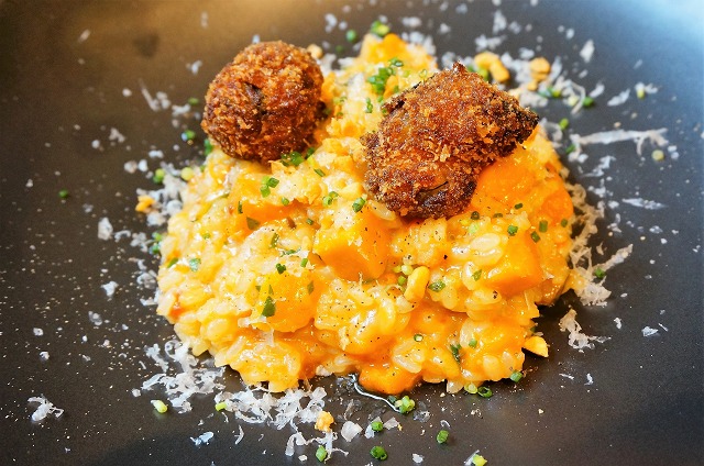 かぼちゃが入ってるので、なんとも珍しいオレンジ色のリゾットです。