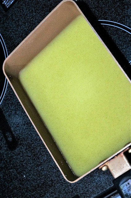 玉子焼き用の小さなフライパンに、水200mlと砂糖20gと片栗粉35g入れて良くかき混ぜます。