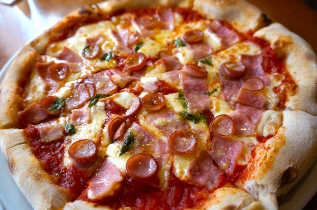 ベーコンとソーセージ、フレッシュなトマトのピザ。(タムタム)